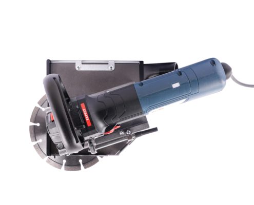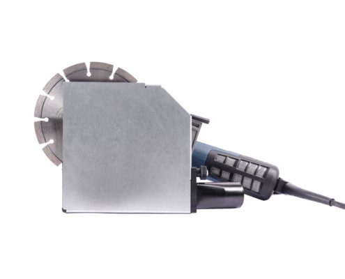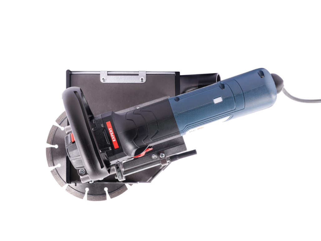 Maschine links in die Ecke schwenken, um Fliesen, Putz, Beton, Befestigungslaschen aus Metall etc. zu durchtrennen.